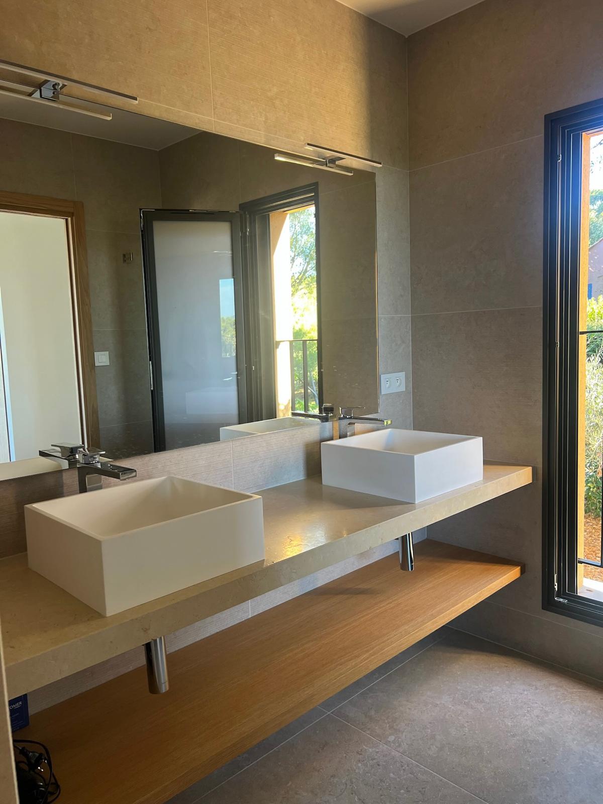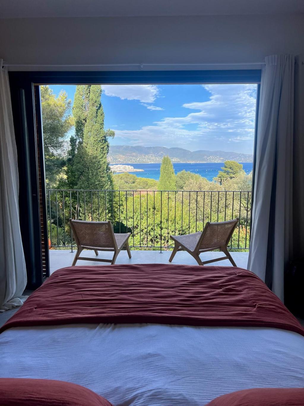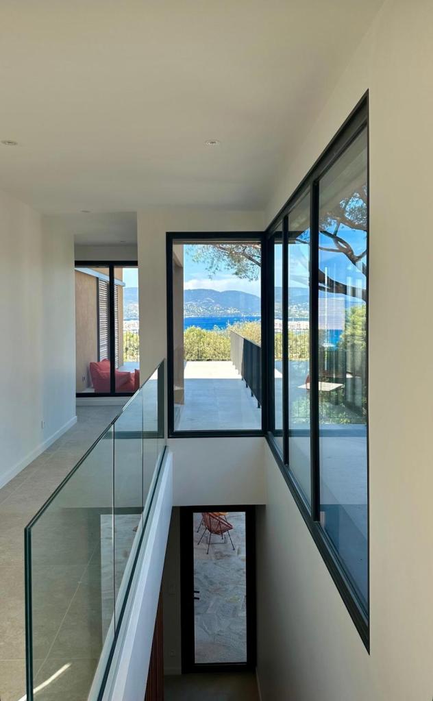 La master suite principale se situe au premier niveau de la villa. Elle offre une belle vue mer et comprend une salle de douche, un wc séparé et un bureau. Elle bénéficie d’un balcon et d’un accès direct à la terrasse principale.
